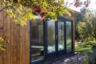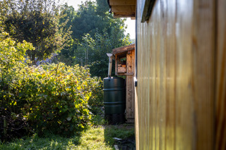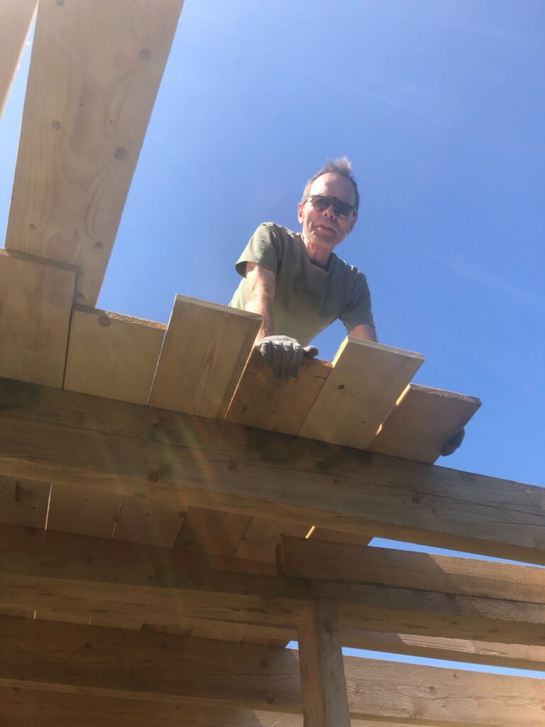 Machteld had graag al een tuinhuisje gehad toen de kinderen klein waren. Maar het leven was toen te vol. Peter was in die tijd bewegingsacteur en kluste bij als verpleegkundige. Machteld werkte als danser. In die jaren hadden ze beiden een nul-uren contract, dus het werk was onregelmatig. Bovendien heeft Peter altijd heel graag zijn eigen huisje willen bouwen. Eerst kwam er een prachtig schuurtje. En nu, sinds een paar jaar, is de bouw van het huisje begonnen. Peter doet het voornamelijk in zijn eentje. Af en toe wat hulp van een aardige tuinbuur die helpt met het versjouwen van de enorme balken. Ook zijn zoons kwamen soms helpen, met het heien van de palen voor de fundering, of het plaatsen van de vloer- en dakbalken en de dakbedekking. Het gaat niet snel, want het moet allemaal tussen zijn werk en opleiding als ‘physician assistant’ door. Maar het gebeurt heel nauwgezet. Op z’n Zwitsers.