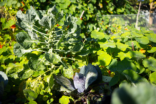 Sinds een paar jaar zijn ze overgestapt op permacultuur. Dit houdt in dat verschillende soorten planten naast elkaar worden gezet, om elkaar te ondersteunen en om plagen te voorkomen. De bodem wordt gezond gehouden door compostering en mulchen (mulchen is het bedekken van de bodem met een laag organisch of anorganisch materiaal, om de grond te beschermen, vocht vast te houden, onkruid tegen te gaan en het bodemleven te beschermen). Planten worden niet meer in rijtjes geplant, maar in kleine groepjes door elkaar heen. Soms komen de oude planten spontaan weer op, zoals vorig jaar een paar tomatenplantjes. Die laten ze staan. Zaaien doen ze voornamelijk in de vollegrond, waarna ze er plastic overheen doen. Ze geven eenmaal per week water. “Je moet de planten niet te veel verwennen, zodat ze wat dieper gaan wortelen,” aldus Peter. In het midden van de moestuin staat een grote bloeiende struik. Een Viburnum of ook wel ‘sneeuwbal’ genoemd. Van daaruit worden de groenten in een stervorm uitgeplant. De kruiden heeft Machteld naast de ingang van de moestuin geplant, zodat ze daar makkelijk bij kan. Om de moestuin heen groeit op dit moment heel veel Oost-Indische kers. Een prachtig tapijt van zachtgroene blaadjes met fel oranje stipjes, onder de appelboom en tegen de schutting van de buren. In de zomer stond er een rijke hoeveelheid goudsbloemen te schitteren. Ze hebben dit seizoen een tweede keer peultjes en erwtjes geplant. Die zijn alweer dapper aan het groeien.
